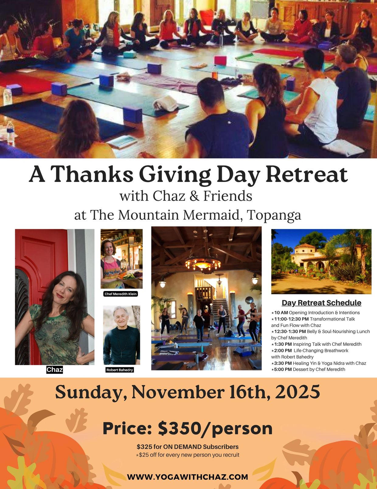 TRAVEL INFO: Since parking is limited, we encourage you to carpool as much as possible. For more info, please contact: joanne@yogawithchaz.com