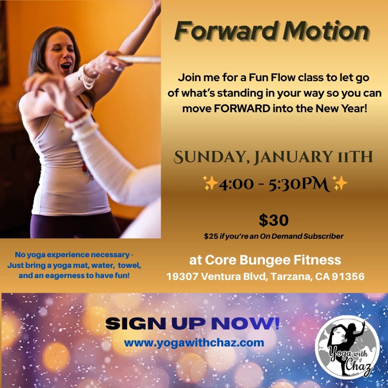"Hi Chaz! Just wanted to thank you for being such an intuitive and well grounded teacher! Your dedication to letting your true self shine is inspirational! Love ya and miss you loads!" -Sarah Morgan